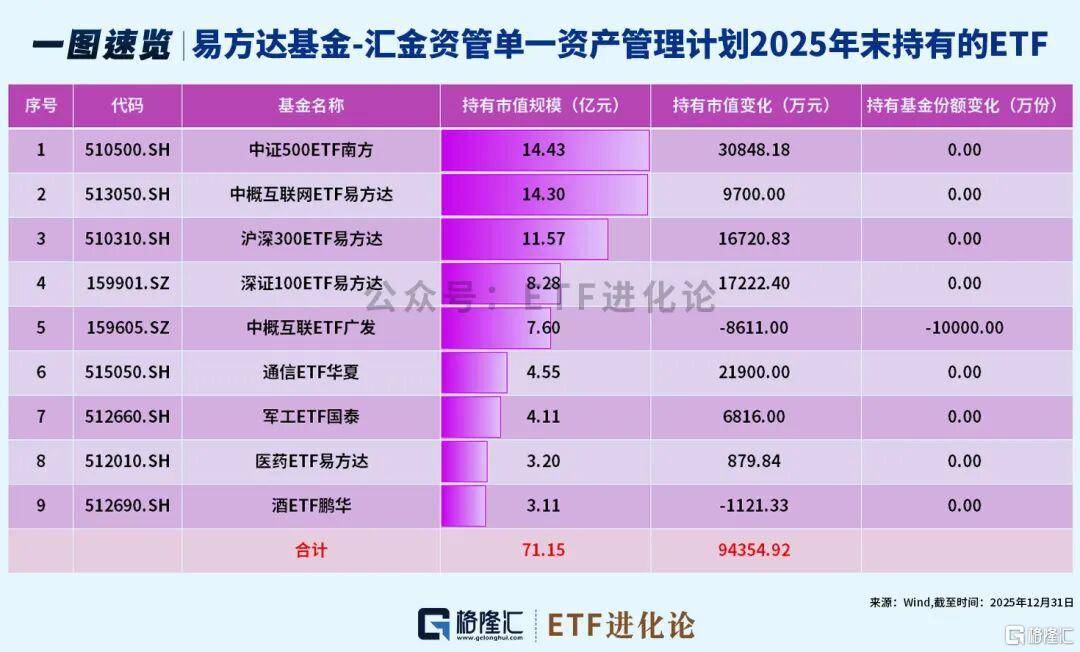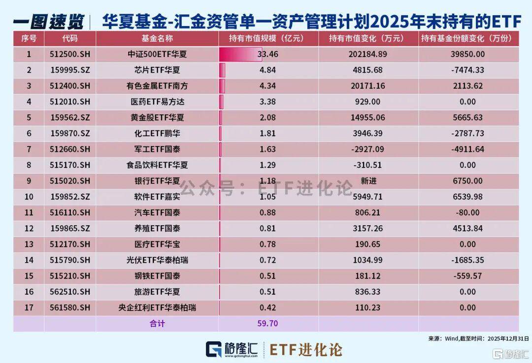 华夏基金-汇金资管单一资产管理计划去年四季度加仓:中证500ETF华夏、有色金属ETF南方、黄金股ETF华夏;新进:银行ETF华夏;减持:芯片ETF华夏、化工ETF鹏华和军工ETF国泰。