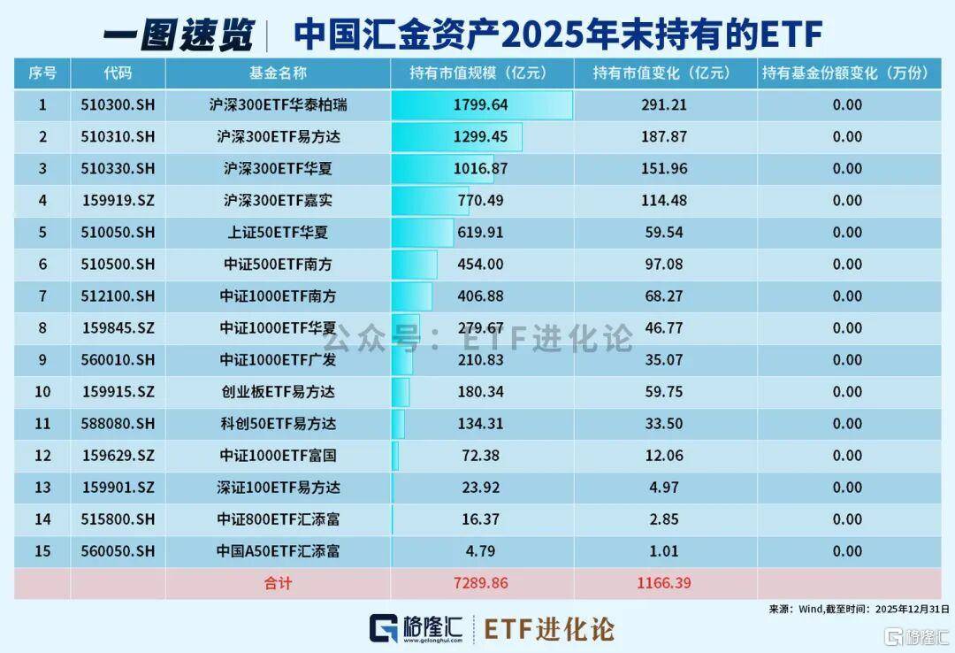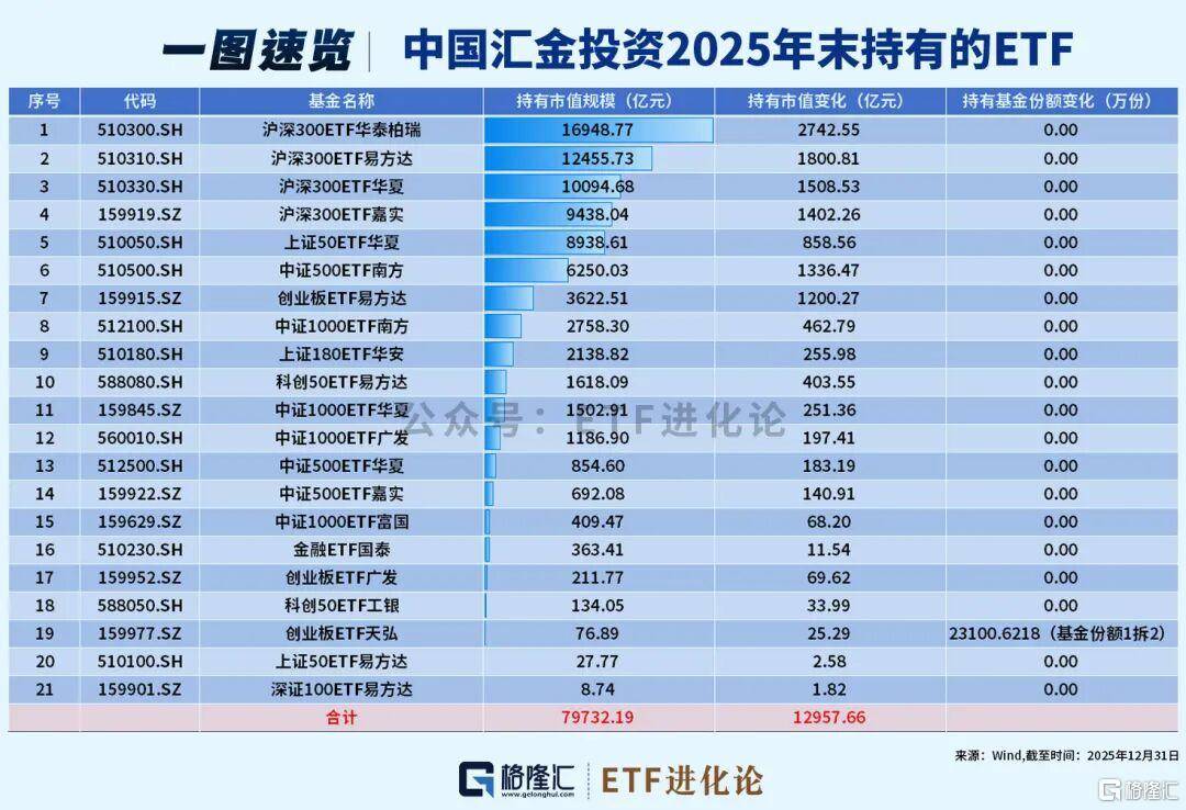 截至2025年年末,中央汇金投资、中央汇金资产的ETF持仓在去年下半年没有变化。