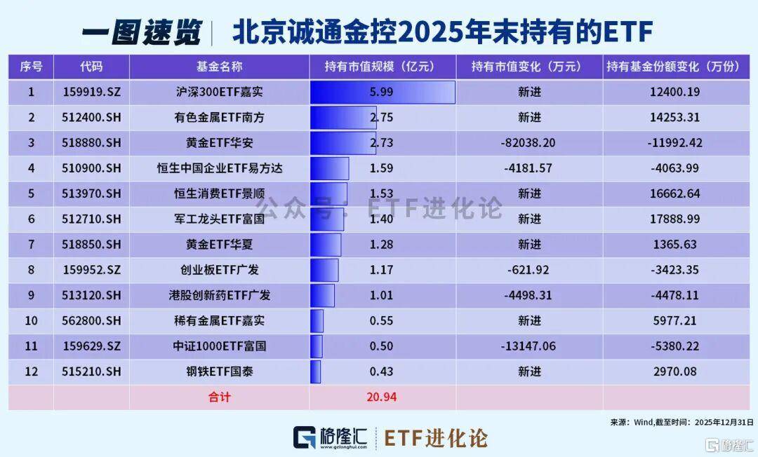 北京诚通2025年下半年新进:沪深300ETF嘉实、有色金属ETF南方、恒生消费ETF景顺、军工龙头ETF富国、黄金ETF华夏、稀有金属ETF嘉实和钢铁ETF国泰,减持黄金ETF华安、恒生中国企业ETF易方达。