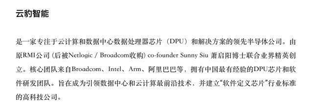 公开资料显示,云豹智能是一家专注于云计算和数据中心数据处理器芯片(DPU)和解决方案的半导体公司。由原RMI公司 (后被Netlogic / Broadcom收购) co-founder Sunny Siu萧启阳博士联合业界精英创立。