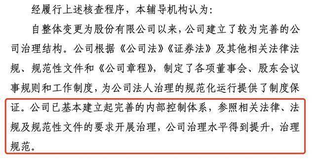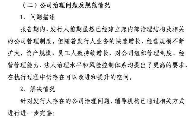 辅导报告中指出,报告期内,公司前期虽然已经建立起内部治理结构及相关的公司管理制度,但随着公司业务的快速增长,经营规模不断扩大,资产规模、员工人数持续增长,对公司组织管理制度、经营管理能力、法人治理水平和风险控制体系均提出了更高的要求,在执行过程中仍存在可以改进和提升的空间。