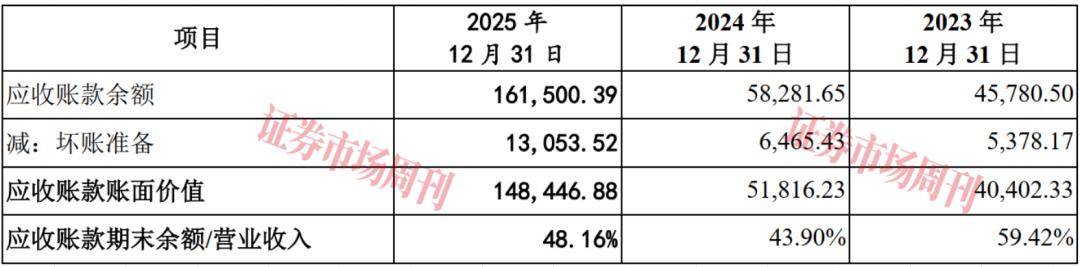 据招股书披露,报告期各期末,绿控传动的应收账款余额分别为4.58亿元、5.83亿元和16.15亿元,占营业收入比例分别为59.42%、43.90%和48.16%。 其中在2024年和2025年,公司应收账款余额分别同比增加了27.31%和177.10%。随着应收账款的快速增长,绿控传动应收账款坏账准备计提金额也在提升,由2023年的5378.17万元提升至2024年的6465.43万元和2025年的13053.52万元。