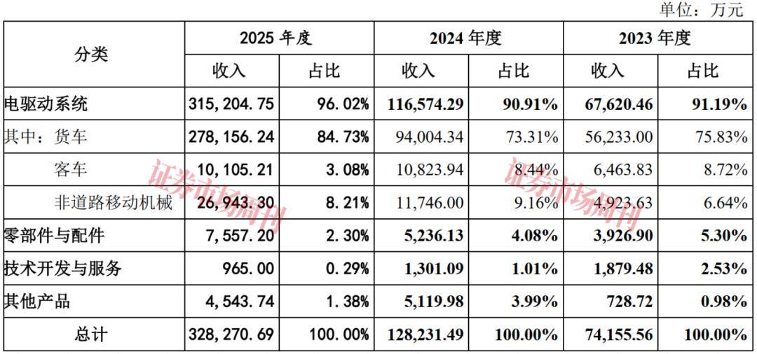 在收入构成上,绿控传动的收入主要来自于货车电驱动系统,报告期内相关收入占比分别达到75.83%、73.31%和84.73%, 而来自客车的收入,2023年和2024年的占比虽然还在8%以上,但到了2025年已下滑至3.08%。