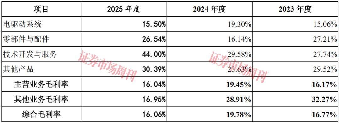 招股书披露,绿控传动报告期内综合毛利率分别为16.77%、19.78%和16.06%,呈先升后降趋势。 在细分项目上,收入占比最高的电驱动系统是对公司综合毛利率影响最大的业务,该业务2024年毛利率高达19.3%。2025年,随着电驱动系统毛利率回落至15.5%,绿控传动的综合毛利率也由2024年的19.78%回落至2025年的16.06%。