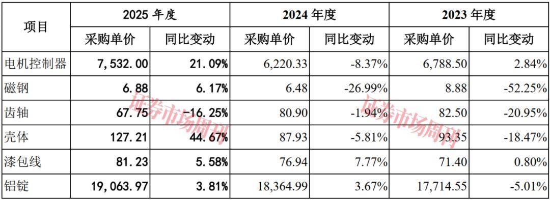 绿控传动生产所需的直接材料主要包括电机控制器、磁钢、齿轴、壳体、漆包线、硅钢等。其中,电机控制器的采购单价在2025年同比上涨21.09%,磁钢的采购单价同比上涨6.17%,壳体采购单价同比上涨44.67%。整体上,公司所披露的6种原材料,只有齿轴采购单价下降了16.25%。