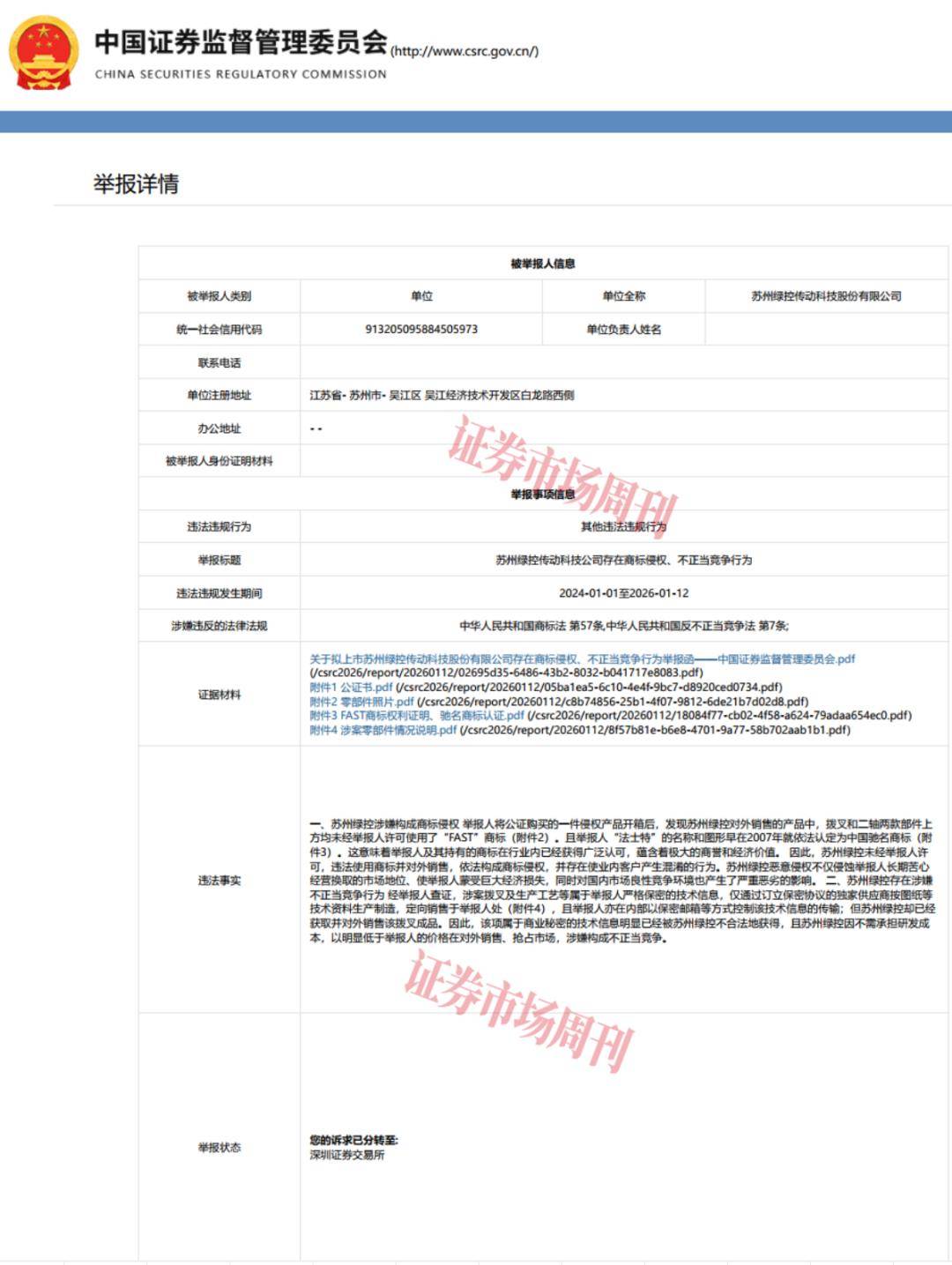 今年1月份,陕西法士特齿轮有限责任公司(以下简称“法士特”)向中国证监会实名举报,认为绿控传动存在商标侵权和不正当竞争行为。
