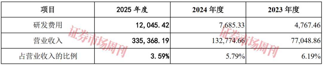 实际上,2023年至2025年,绿控传动的研发费用分别为4767.46万元、7685.33万元和12045.42万元,占营业收入比例分别为6.19%、5.79%和3.59%,研发费用率呈逐年下降趋势。统计数据显示,公司最近三年累计研发投入为24498.21万元,占累计营业收入的比重约为4.49%。