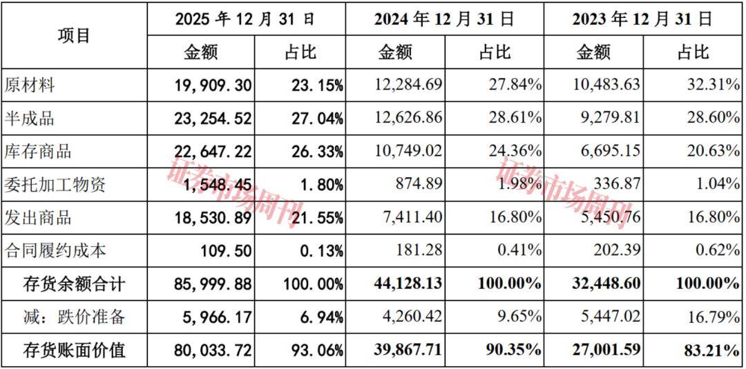 存货方面,绿控传动报告期内的存货余额分别为3.24亿元、4.41亿元和8.60亿元,其中2024年和2025年存货余额分别同比增长了35.99%和94.89%。存货的增加,导致公司在报告期各期末计提的存货跌价准备分别为5447.02万元、4260.42万元和5966.17万元,占当期存货账面余额的比例分别为16.79%、9.65%和6.94%。