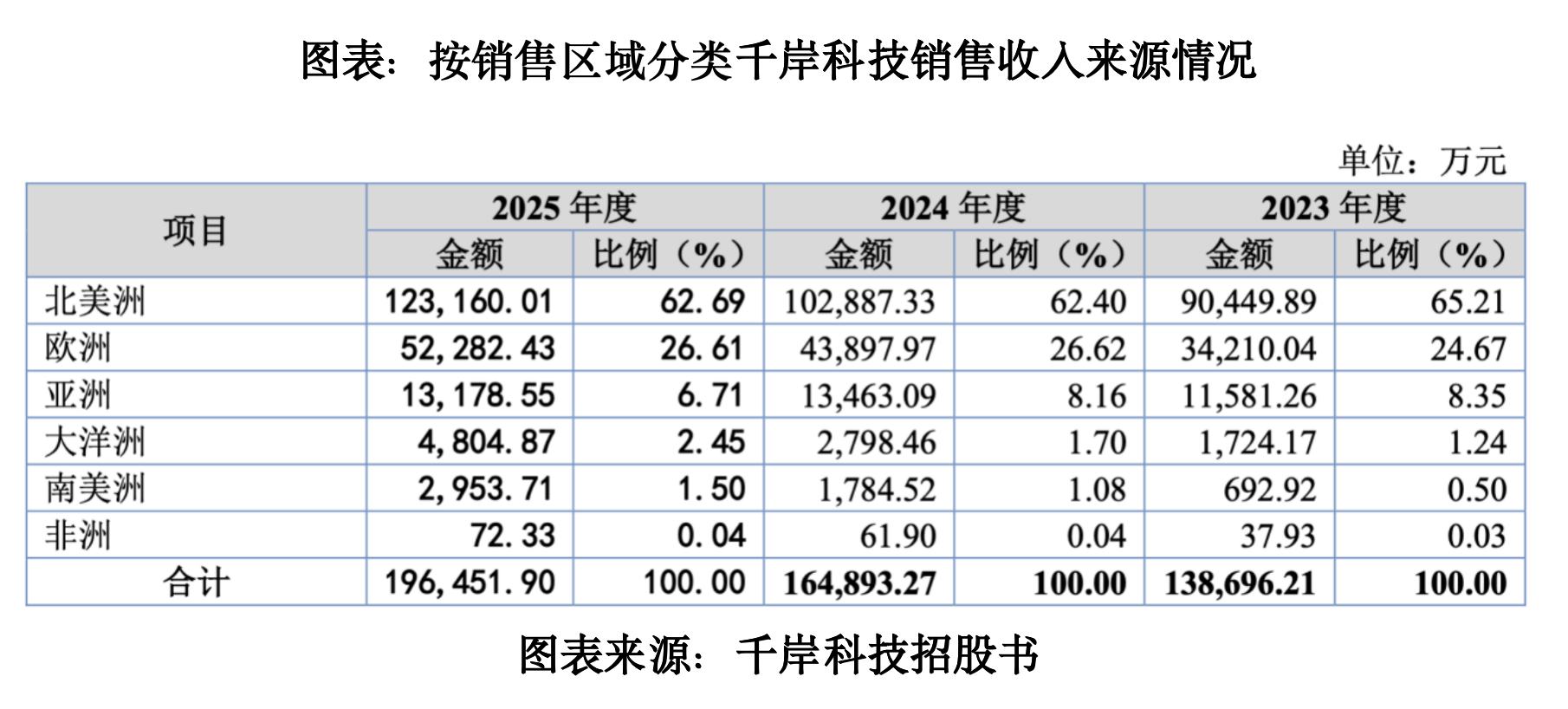 招股书显示,千岸科技的主要销售区域为北美洲及欧洲地区,2023—2025年,上述两大市场的合计收入占主营业务收入的比例分别为89.88%、89.02%、89.30%。其中,北美洲为该公司第一大销售地区,同期收入占主营业务收入的比例分别为65.21%、62.40%、62.69%。