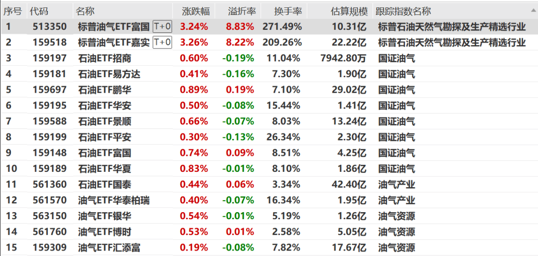 以下是跟踪上述四大指数的相关ETF产品,目前,两只标普油气ETF溢价率均超8%。