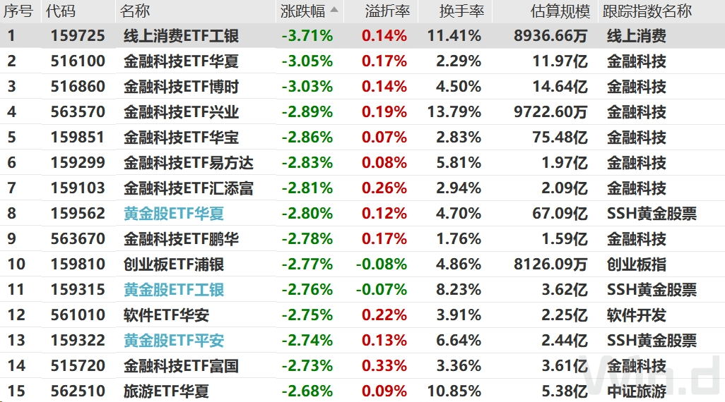 消费、金融科技、黄金股相关ETF跌幅居前,其中,线上消费ETF工银跌3.71%。