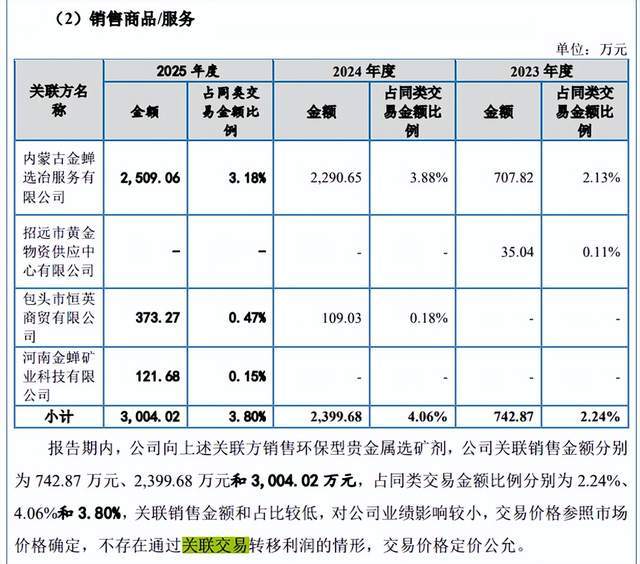 报告期内,森合高科向两家公司主要销售环保型贵金属选矿剂,其中与内蒙古金蝉的交易金额分别为707.82万元、2290.65万元、2509.06万元;2024年和2025年,与恒英商贸的交易金额分别为109.03万元、373.27万元。