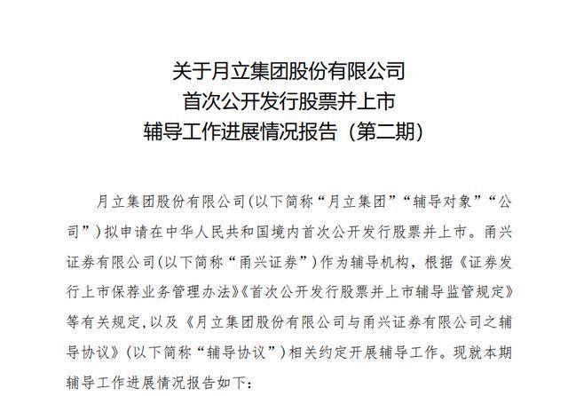 乐居财经 李兰4月8日,月立集团股份有限公司(以下简称“月立集团”)披露公司首次公开发行股票并上市辅导工作进展情况报告(第二期),辅导机构为甬兴证券有限公司。