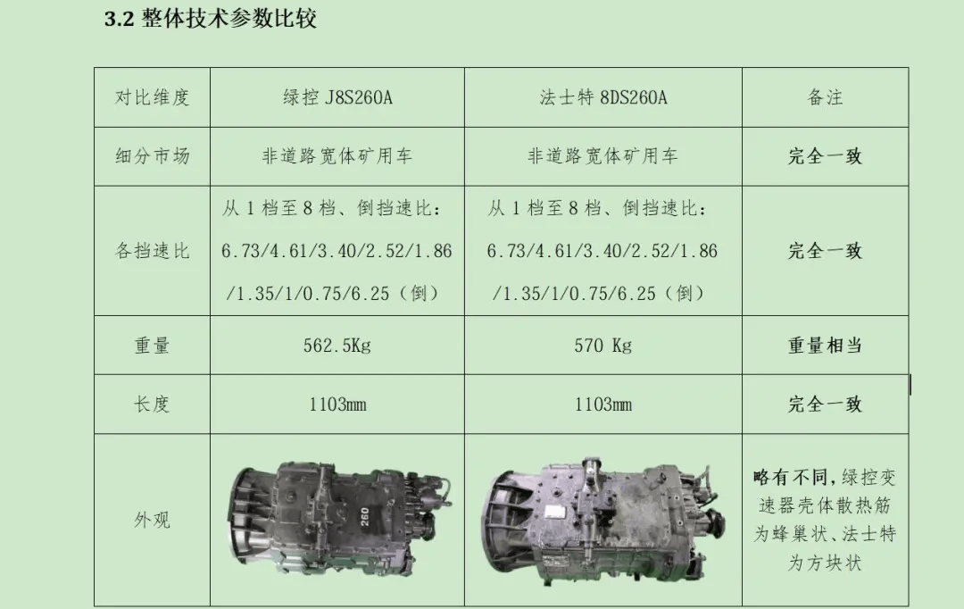 纠纷的核心指向了绿控传动型号为J8S260A的变速器总成。