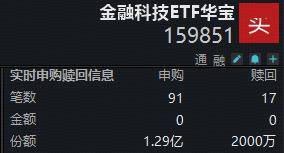 热门ETF方面,昨日绝地反击超6%后,同类规模最大的金融科技ETF华宝(159851)再陷回调,场内收跌2.86%,成交超2亿元。资金悄然涌入,单日净申购1.09亿份。