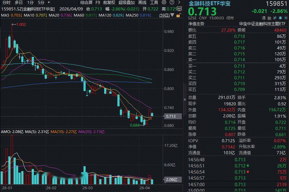 无惧行情波动,资金逢跌抢筹!前一日大反弹后,金融科技领跌两市,同类规模最大*的金融科技ETF华宝(159851)场内收跌2.86%,资金悄然涌入,单日净申购1.09亿份。