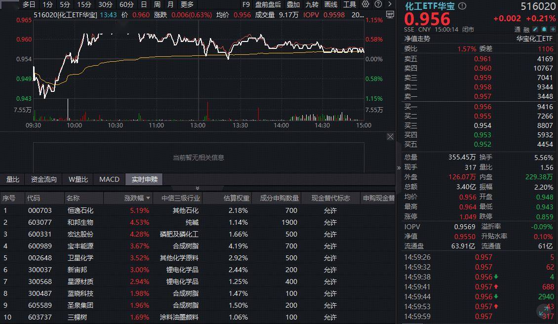 成份股方面,石化、磷化工、锂电等板块部分个股涨幅居前。截至收盘,恒逸石化飙涨5.19%,和邦生物、宏达股份双双大涨超4%,宝丰能源、卫星化学、新宙邦等多股涨超3%。