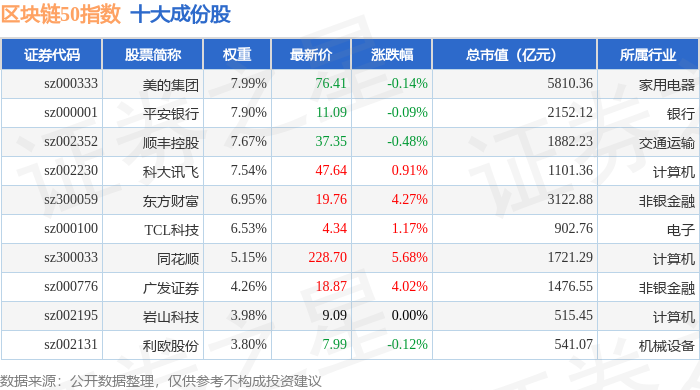 区块链50(399286)指数十大成份股详情如下: