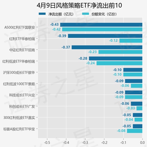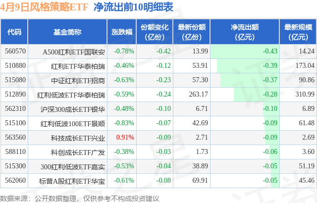 当日有15只风格策略ETF基金出现资金净流出,其中净流出排首位的是A500红利ETF国联安(560570),份额减少了4200.0万份,净流出额为4272.57万元。