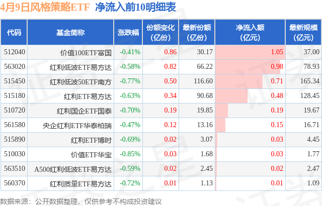 当日有11只风格策略ETF基金出现资金净流入,其中净流入排首位的是价值100ETF富国(512040),份额增加了8600.0万份,净流入额为1.05亿元。
