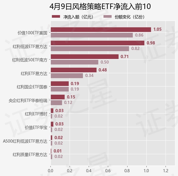 证券之星消息,4月9日风格策略ETF基金合计资金净流入1.67亿元,近5个交易日累计净流入25.26亿元,5个交易日中出现日合计资金净流入的有4天(ETF资金流向计算公式:(当日ETF场内流通份额-前一交易日ETF场内流通份额)*当日ETF均价,计算结果仅供参考)。