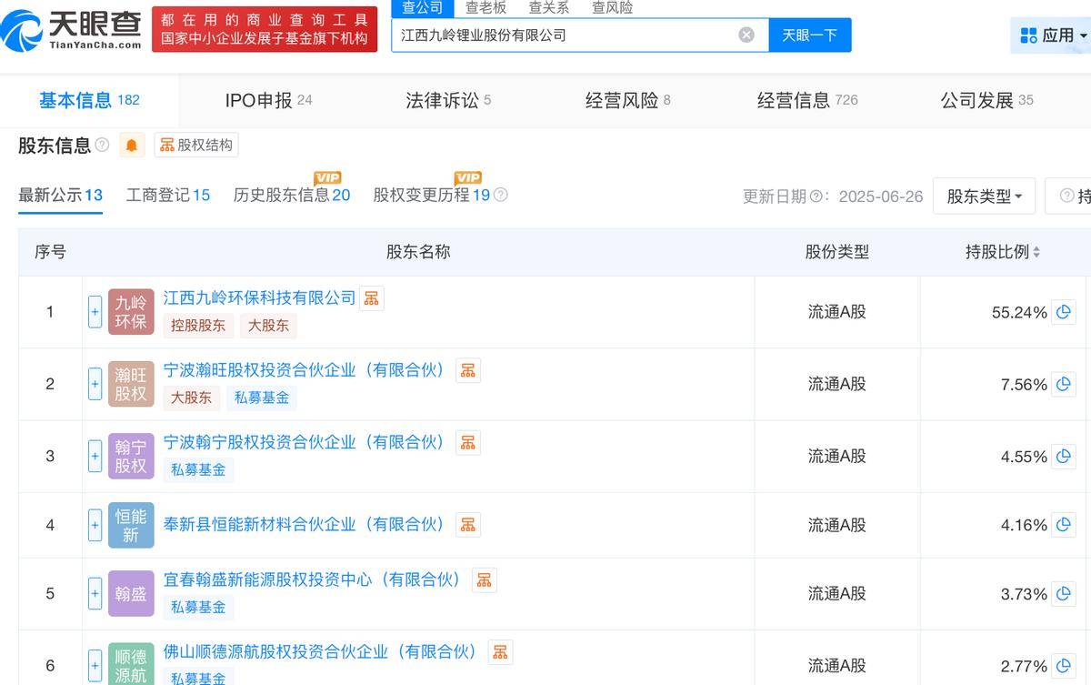 天眼查App信息显示,九岭锂业成立于2011年3月,前身为奉新县春荣陶瓷原料有限公司。目前,该公司的注册资本为4.5亿元,法定代表人为魏绪春,主要股东包括九岭环保、宁波瀚旺等。