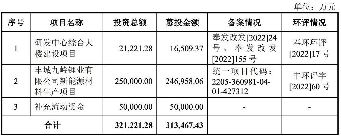 对比可知,九岭锂业的募资金额相对增加了26.7亿元。同时,募投项目也发生变化,新增了“丰城九岭新能源材料生产项目”,拟投入资金24.7亿元。而2024年12月的招股书则再次调整了募集资金项目。