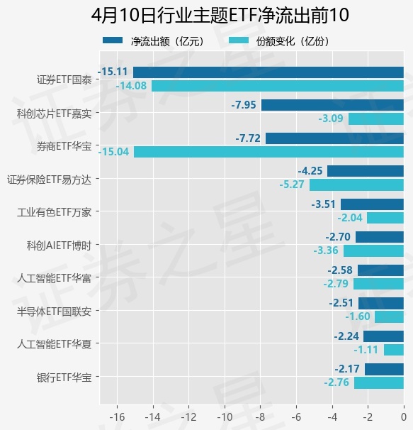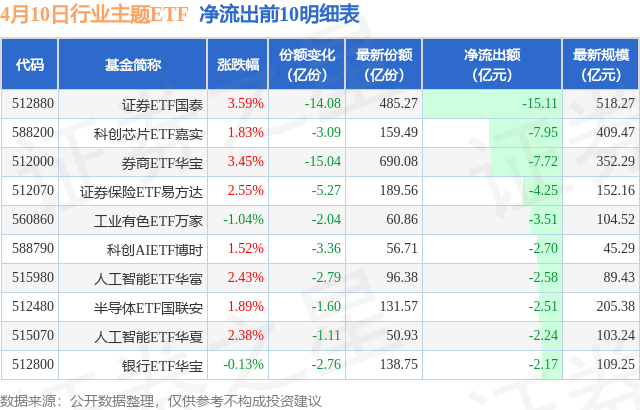 当日有198只行业主题ETF基金出现资金净流出,其中净流出排首位的是证券ETF国泰(512880),份额减少了14.08亿份,净流出额为15.11亿元。