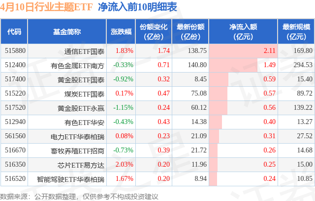 当日有68只行业主题ETF基金出现资金净流入,其中净流入排首位的是通信ETF国泰(515880),份额增加了1.74亿份,净流入额为2.11亿元。