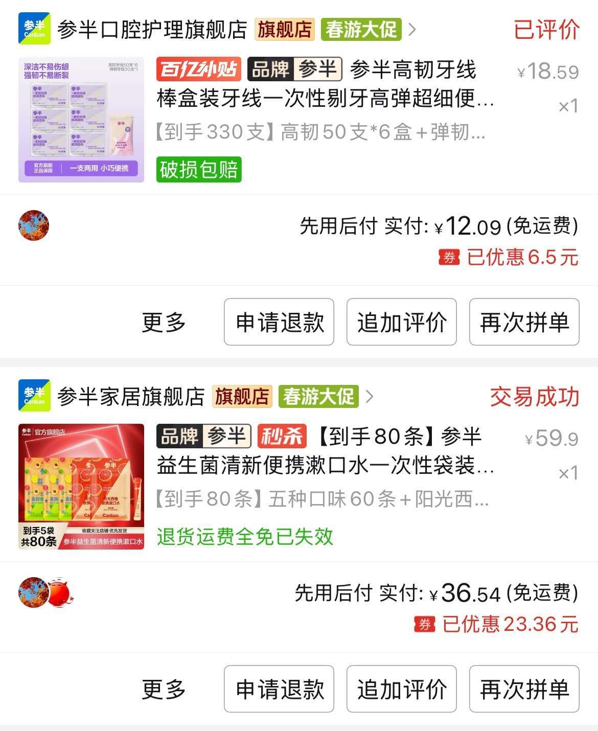闪闪是从2025年开始买“新消费品牌”的口腔护理产品的。“在KKV种草了参半的漱口水,花样很多,每一个味道都不踩雷,小小一条放在包包里,出去社交也不担心有口气了。后来又在抖音拼多多买,一条只要5毛钱。”从抖音等线上平台切入,参半实现了果味漱口水到牙膏、口喷、牙线棒、牙刷等口腔清洁类产品的全覆盖,悄悄占领了年轻人的洗漱台。