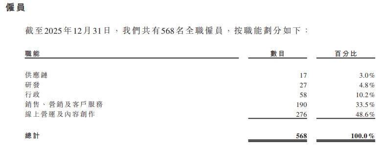 参半踩准了2020年前后的抖音电商红利。当时平台流量成本尚低,参半将大量资源投入短视频和直播间,用高颜值包装、果味香型、低单价策略快速获客。这种打法延续至今,并直接反映在公司的员工结构上:截至2025年末,小阔集团568名员工中,线上运营及内容创作人员多达276人,占比接近50%;而研发人员仅27人,占比不足5%。