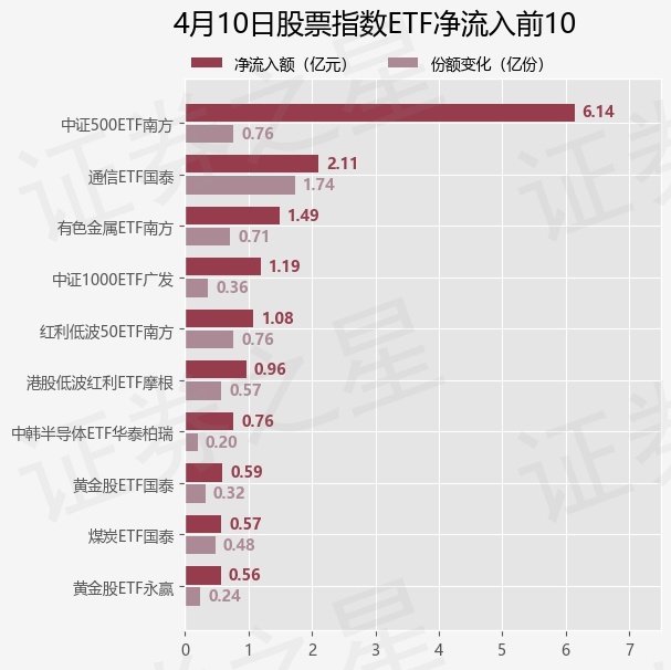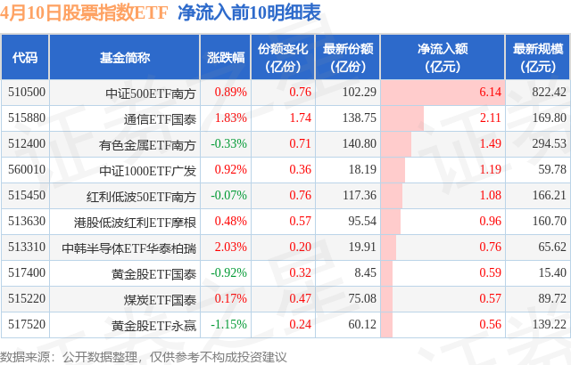 当日有122只股票指数ETF基金出现资金净流入,其中净流入排首位的是中证500ETF南方(510500),份额增加了7600.0万份,净流入额为6.14亿元。