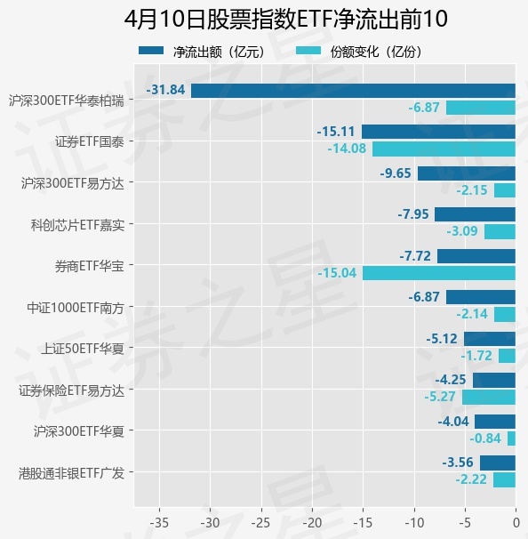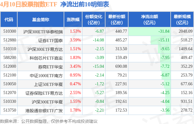 当日有324只股票指数ETF基金出现资金净流出,其中净流出排首位的是沪深300ETF华泰柏瑞(510300),份额减少了6.87亿份,净流出额为31.84亿元。