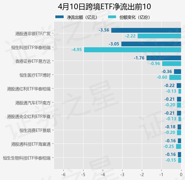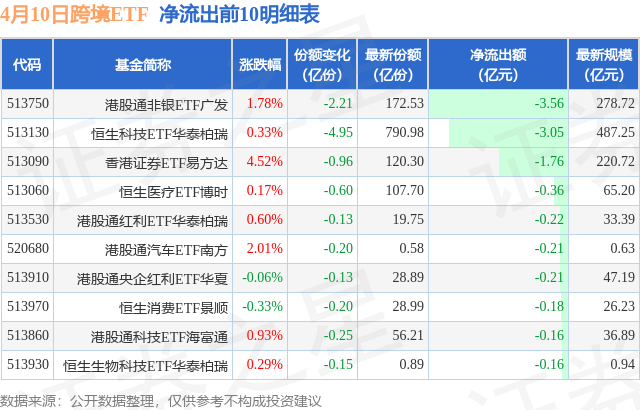 当日有23只跨境ETF基金出现资金净流出,其中净流出排首位的是港股通非银ETF广发(513750),份额减少了2.21亿份,净流出额为3.56亿元。