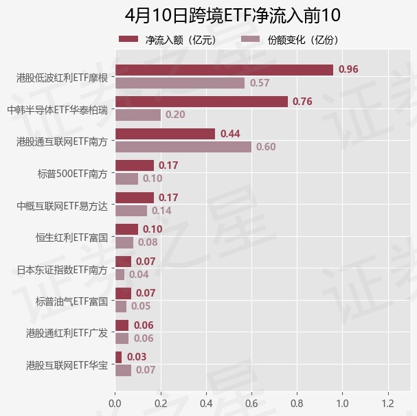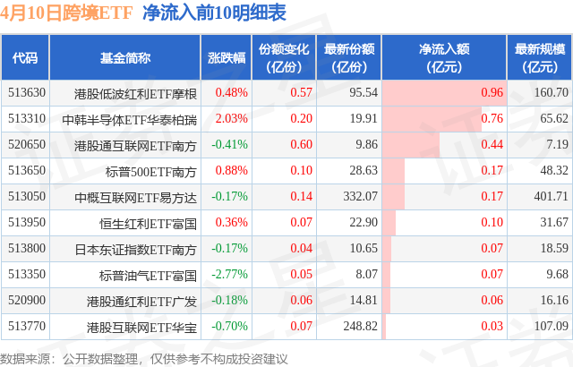 当日有25只跨境ETF基金出现资金净流入,其中净流入排首位的是港股低波红利ETF摩根(513630),份额增加了5700.0万份,净流入额为9570.52万元。