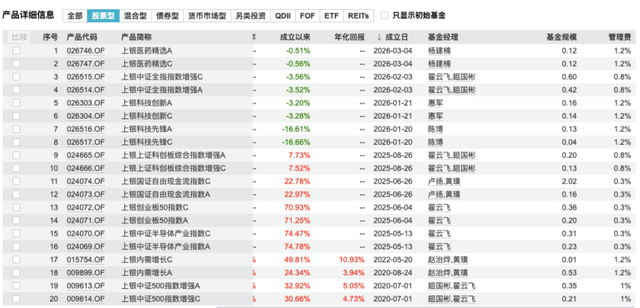 值得关注的是,上银基金2026年以来成立的4只股票型产品,目前回报率均为负。其中上银中证全指指数增强A、C规模分别为0.42亿、0.6亿元,成立以来回报率-3.52%、-3.56%,跑输同期沪深300指数回报率0.66%,同类排名912/965、913/965。