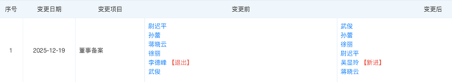 根据天眼查信息,2025年12月,上银基金董事会成员李德峰退出,新增董事吴显玲;对比上次变动后的董事备案信息,此次董事名单9人,留任5人,分别为武俊、孙蕾、尉迟平、吴显玲、蒋晓云;离任1人徐丽;新增4人,分别为姚之俊、吴迪、Jack Treunen、王明德。