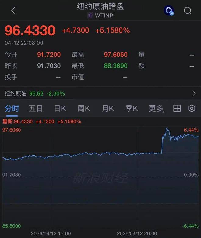 纽约原油暗盘直线拉涨6%,截至发稿,涨幅为5.15%。