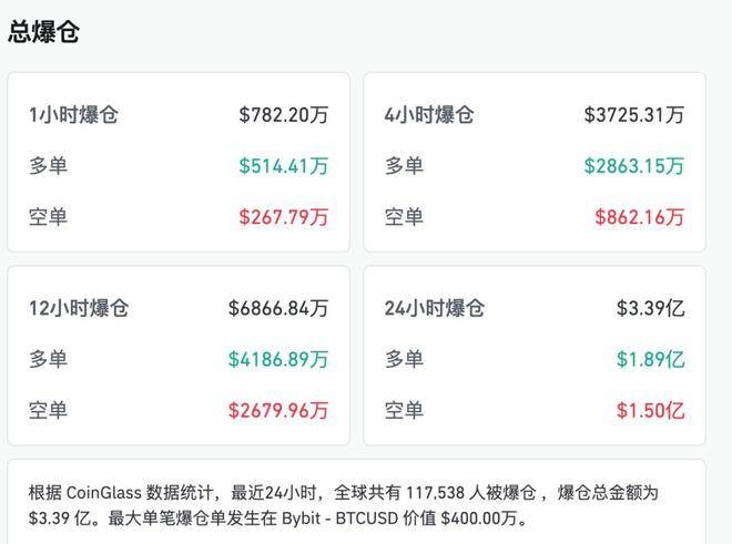 截至发稿,最近24小时,全球共有117538人被爆仓。