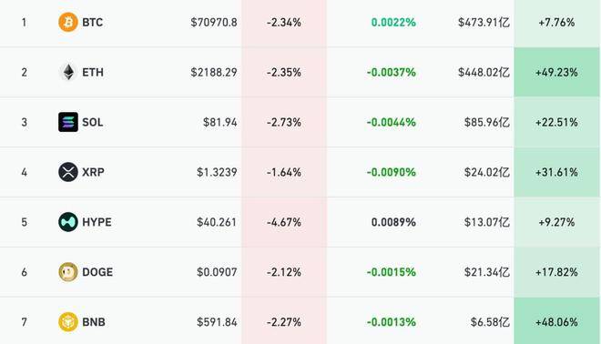 4月12日,加密货币集体大跌,晚间进一步跳水,截至发稿,比特币跌超2.3%,报70970美元/枚,以太坊、SOL、狗狗币等同步下跌。
