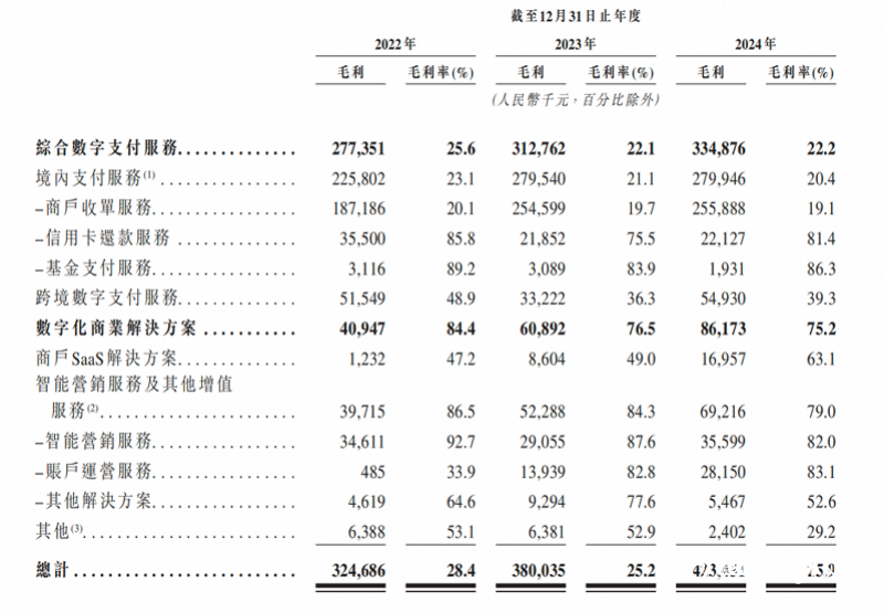 同时,其毛利率也不容乐观。2022年到2023年,富友支付的毛利率由28.4%下滑至25.2%,2024年小幅增长至25.9%。对于毛利率下滑,招股书介绍,一方面是交易量增加令收单服务的佣金增加,合作伙伴获得了更高的佣金率,这使得境内支付服务的毛利率由2022年的23.1%降至2023年的21.1%,另一方面,由于市场竞争导致服务费减少及佣金增加,跨境数字支付服务业务的毛利率由2022年的48.9%降至2023年36.3%,后续会通过调整业务策略来减轻高佣金率对毛利率的影响。