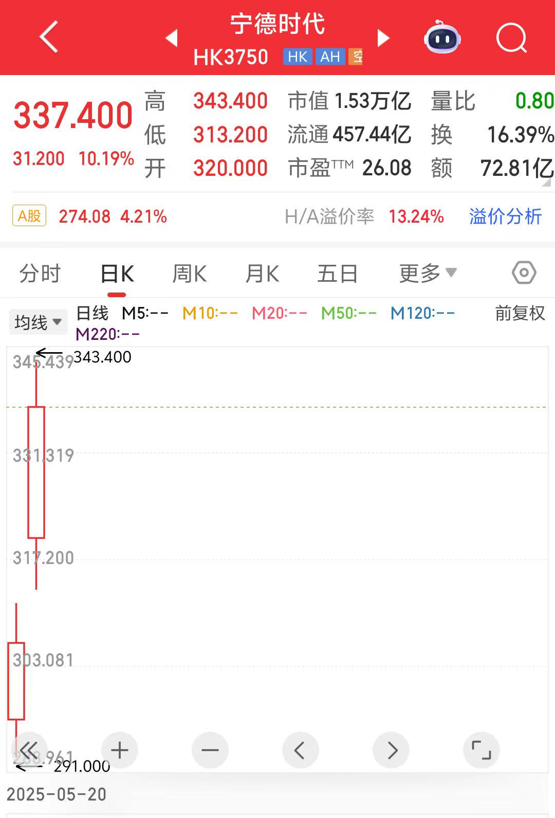 截至收盘,宁德时代H股较A股小幅溢价,其A股报274.08元/股,港股报337.40港元,这一情况在港股较为罕见。