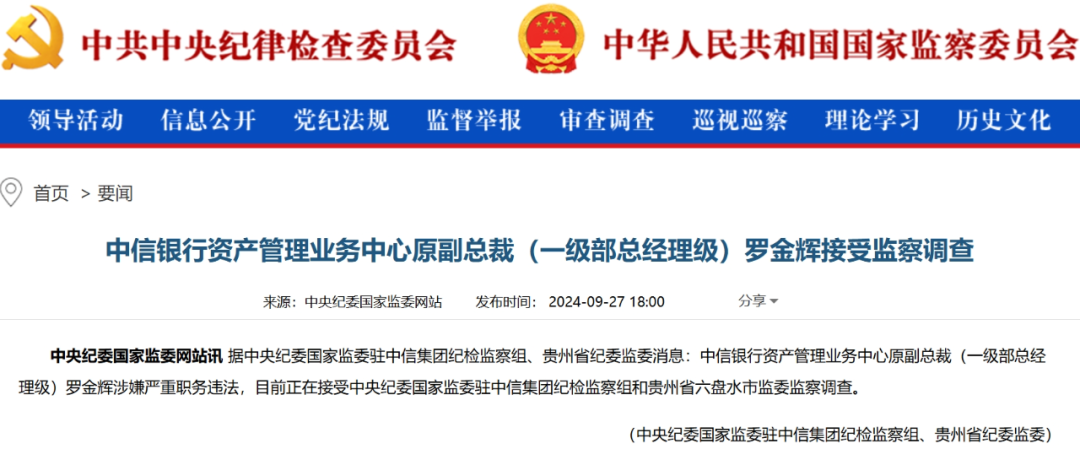 2024年9月27日,中央纪委国家监委网站通报,中信银行资产管理业务中心原副总裁(一级部总经理级)罗金辉涉嫌严重职务违法,目前正在接受中央纪委国家监委驻中信集团纪检监察组和贵州省六盘水市监委监察调查。