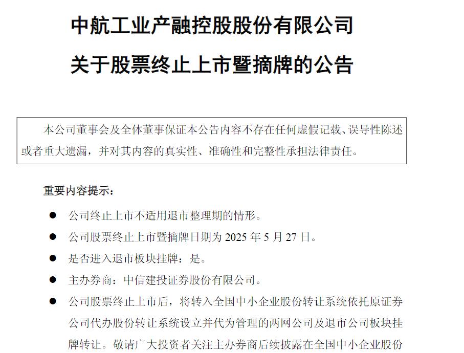 中新经纬5月21日电 中航产融21日晚公告,当日收到上海证券交易所作出的《关于中航工业产融控股股份有限公司股票终止上市的决定》(〔2025〕117号),上海证券交易所决定终止公司股票上市。