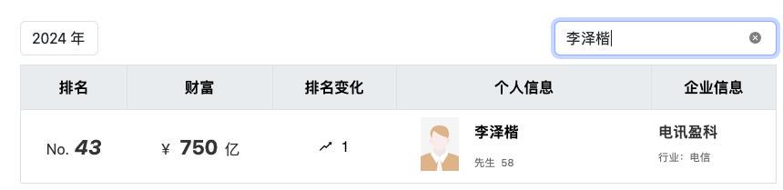 李泽楷靠着自己的能力虽闯出了一片天,但与父亲创造的财富相比仍存在一定差距。据胡润百富榜显示,2024年李嘉诚家族财富值2000亿元,排名第六,李泽楷则排名43,财富值750亿元。