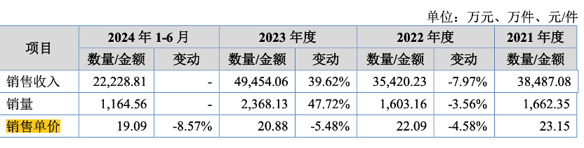 该产品销售单价在报告期内不断下滑,2021年单价为23.15元/件,2022年下滑4.58%至22.09元/件,2023年继续下滑5.48%至20.88元/件,2024年上半年更是下滑了8.57%。