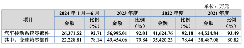 报告期各期,汽车传动系统零部件产品分别实现收入4.45亿元、4.16亿元、5.70亿元,以及2.64亿元,占比主营业务收入分别为93.49%、92.18%、92.01%,以及92.71%。而作为营收“主力”的变速箱零部件产品,报告期各期实现收入金额分别为3.85亿元、3.54亿元、4.95亿元,以及2.22亿元,占比主营业务收入依次为80.82%、78.44%、79.84%,以及78.14%。
