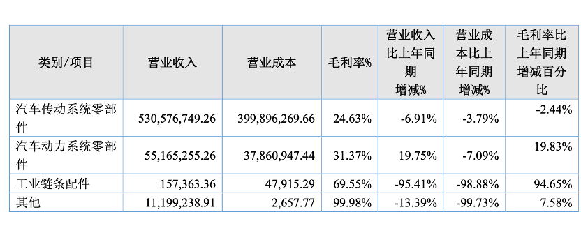 其中,汽车传动系统零部件产品的营业收入较2023年同期下降6.91%,营业成本同期下降3.79%,毛利率同期下滑2.44%。