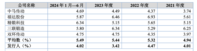 报告期内,公司研发费用率分别为4.01%、4.47%、3.42%,以及4.02%,低于行业平均数的4.94%、5.33%、5.44%,以及5.49%,且17项发明专利均围绕传统燃油车零部件,新能源领域仅停留在“技术储备”阶段。