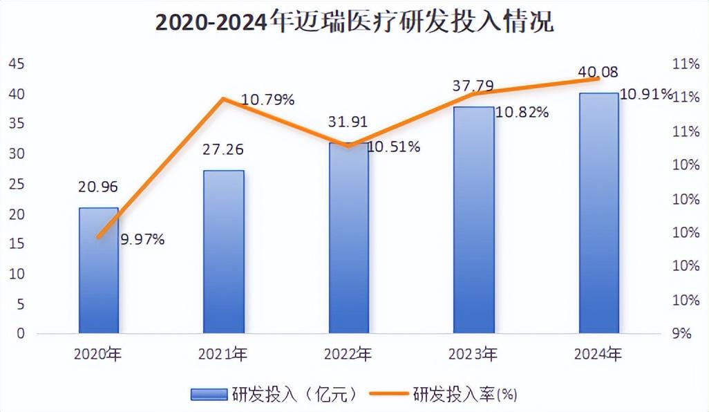 当然,这离不开迈瑞医疗对于研发的持续投入。2020-2024年,公司的研发投入从20.96亿元增至40.08亿元,几乎翻倍。同期,公司研发投入率也从9.97%攀升至10.91%。